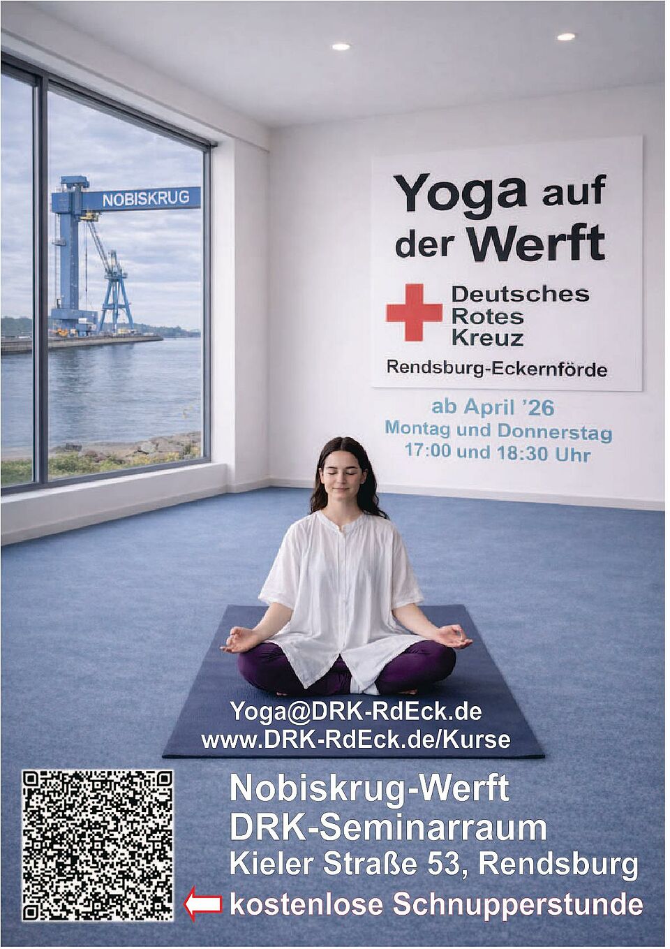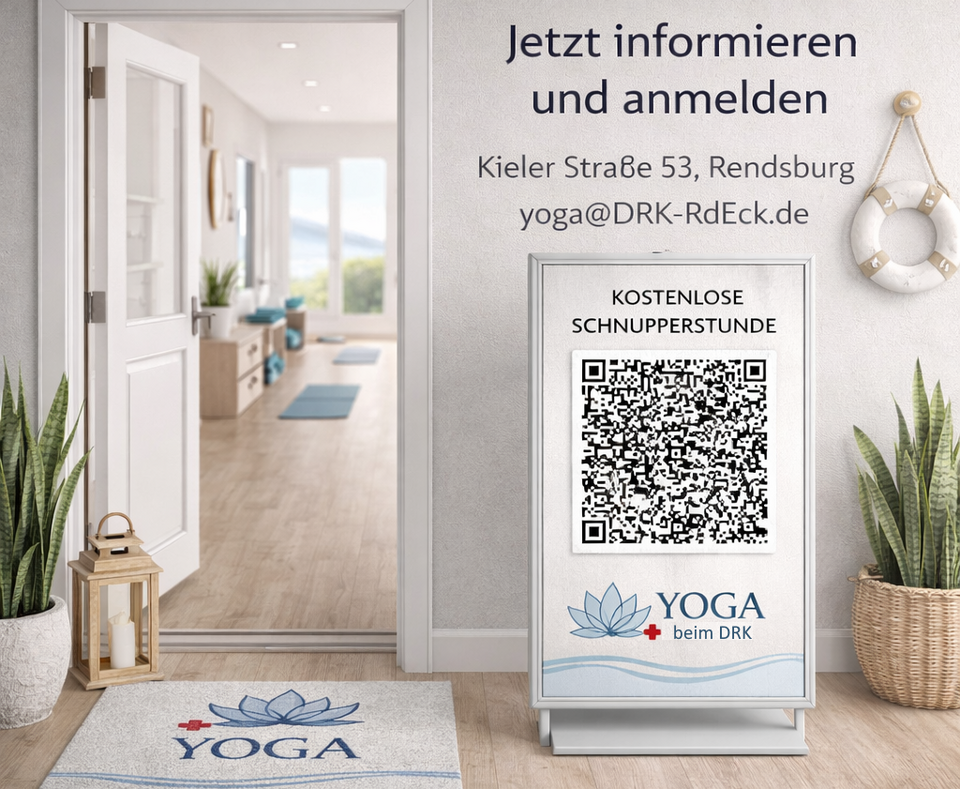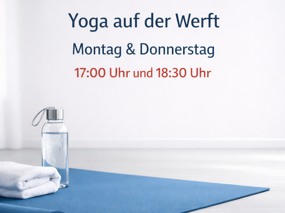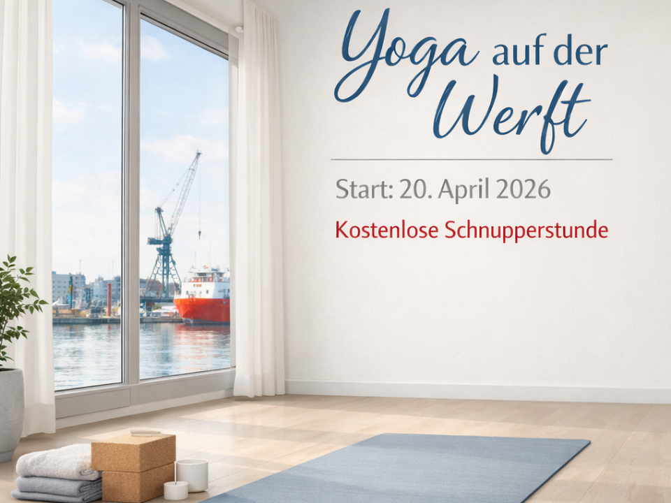 Sie möchten gerne an einer kostenlosen Schnupperstunde für “Yoga auf der Werft” ab dem 20.04.2026 entweder am Montag oder Donnerstag (17:00 Uhr oder 18:30 Uhr) teilnehmen? Dann schreiben Sie uns doch (nutzen Sie auch den QR Code s.unten), oder rufen Sie an