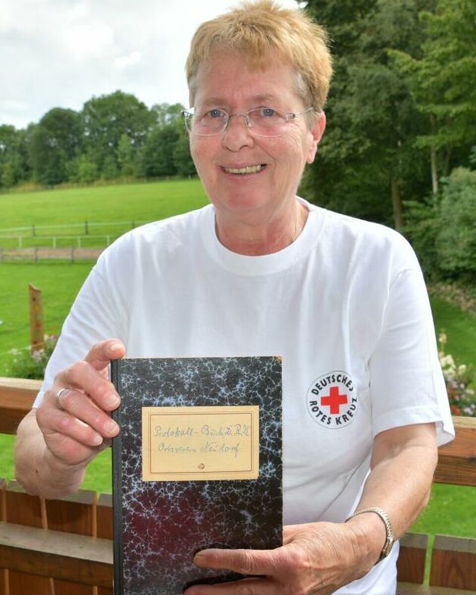 Karin Büchler (64) hat das Amt der Vorsitzenden 2002 übernommen. Sie verwahrt die DRK-Unterlagen, dazu gehört auch das Protokollbuch aus den Anfangsjahren. Foto: Karkossa-Schwarz/Amt Dänischer Wohld
