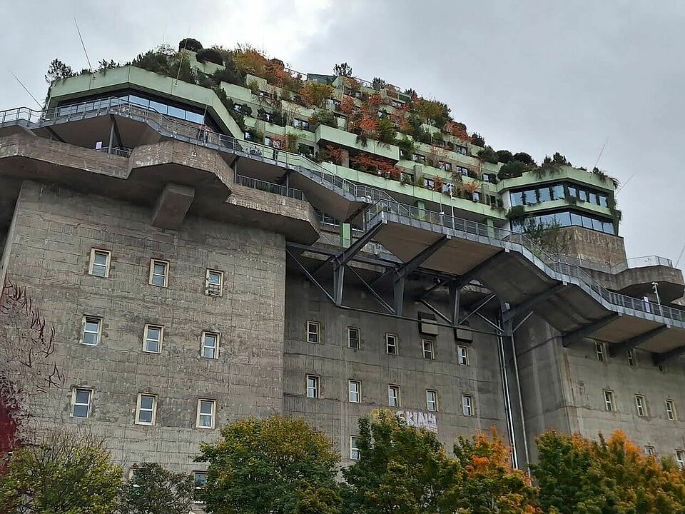 Unser 1. Ziel war der Bunker in Hamburg. Der Bunker diente im 2. Weltkrieg als Flakbunker, während des Luftkrieges der Luftabwehr und den Menschen des Stadtteils als Schutzraum. Nach dem Krieg machte sich die Stadt über die Nutzung des Bunkers Gedanken. Eine 5-stöckige Aufstockung des Bunkers schaffte Raum für Hotel, Gastronomie, Fitness und Events. Die begrünte Fassade und Dach verwandelten das Geschichtsträchtige Bauwerk in eine urbane Oase. Von der Dachterrasse hatten wir einen fantastischen Blick über die Hansestadt Hamburg.